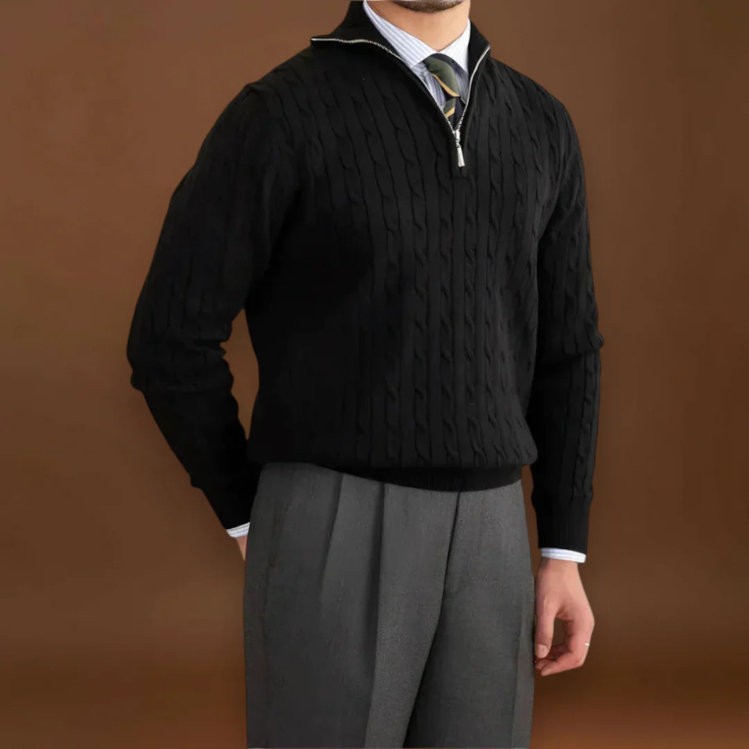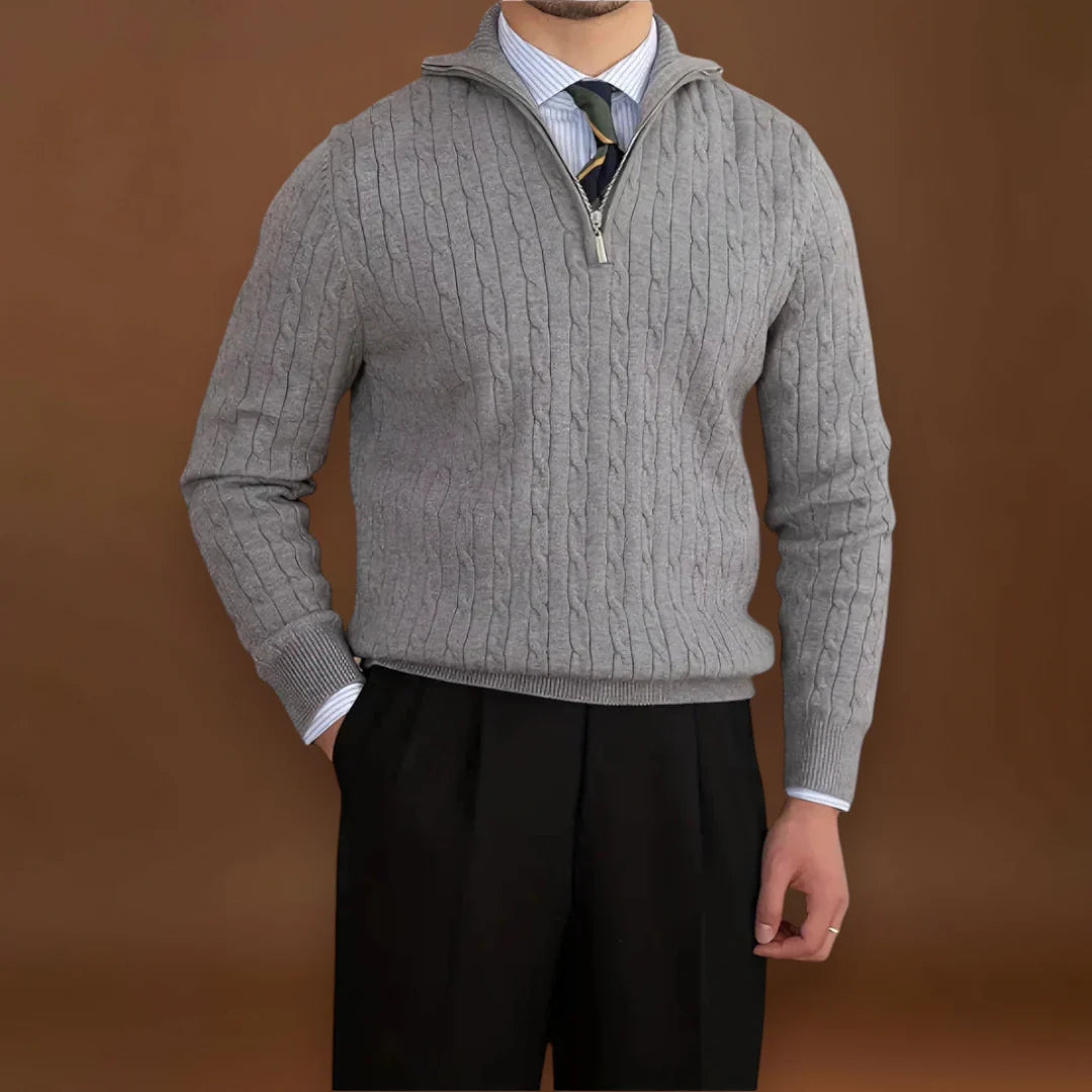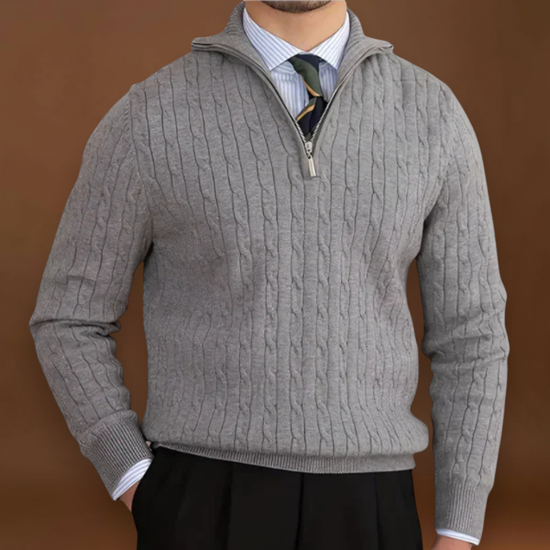 Ez a zsinór kötésű pulóver negyed cipzárral rendelkezik, és struktúrált kötött anyagból készült. A cipzár lehetővé teszi a gallér nyitását, ami segít a légáram szabályozásában, és megkönnyíti a pulóver felvételét és levételét. A zsinór kötés textúrája vastagságot ad ott, ahol szükséges a hő megtartásához, miközben némi légáteresztő képességet is biztosít a kötésen keresztül.