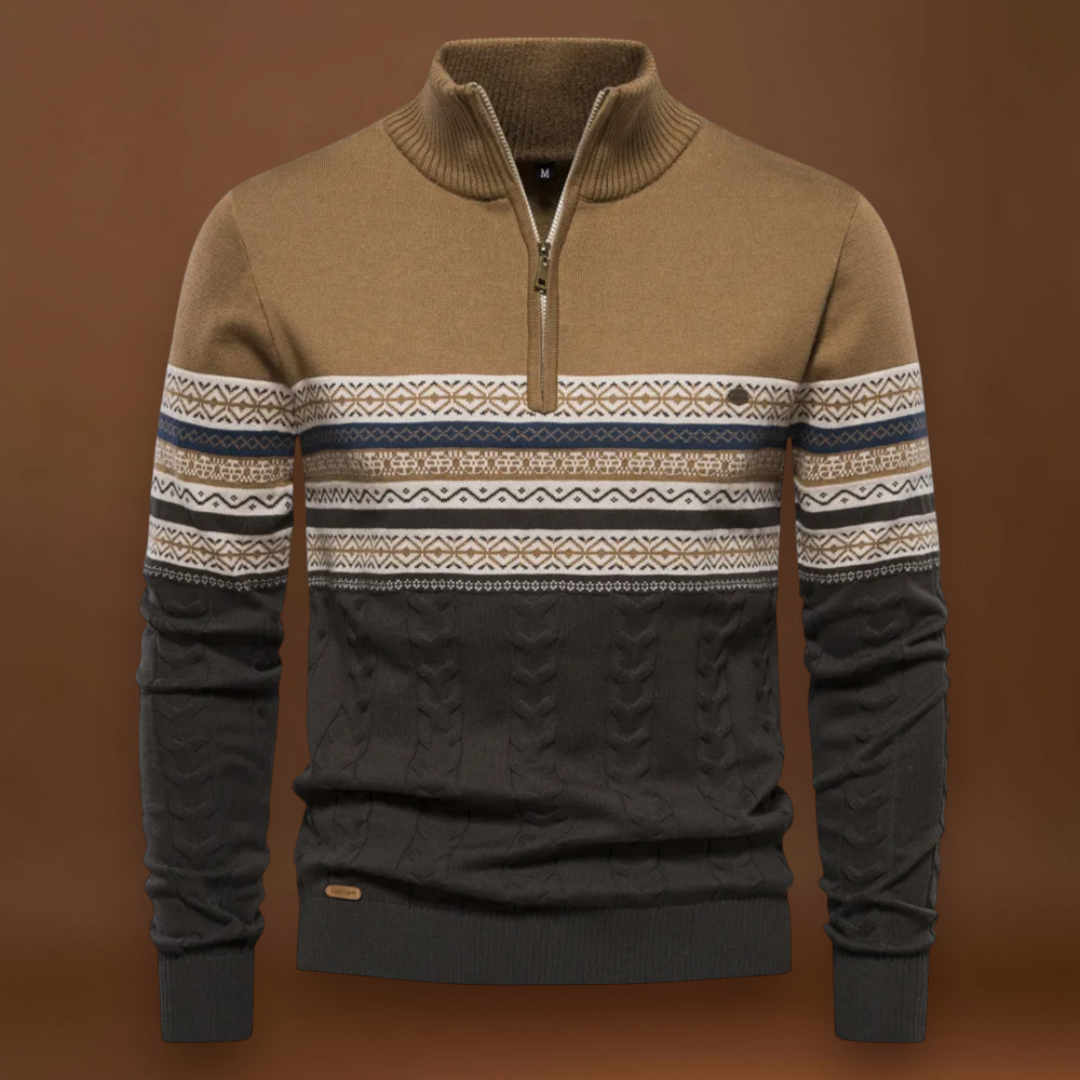 A jumper Alpenfrost egy kétszínű alpesi mintával rendelkezik, amely kábelmintás részletekkel rendelkezik, amelyek textúrát és struktúrát adnak hozzá. A negyed cipzáras nyitás lehetővé teszi a szabályozható szellőzést és egy egyszerű nyakkivágás formázását. A kötött anyag egyensúlyt biztosít a kényelmes tapintás és a tartós használat között.