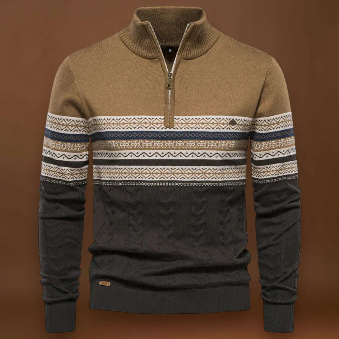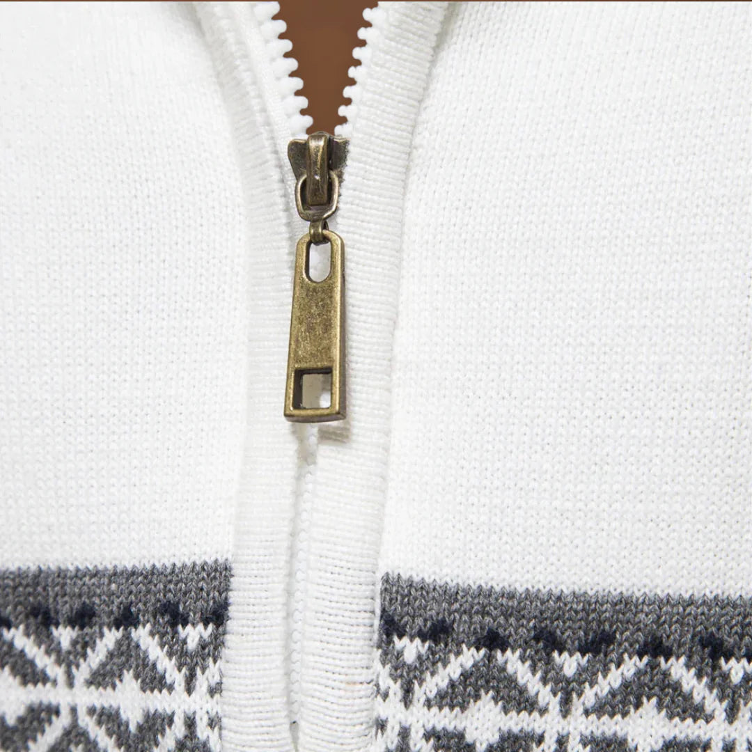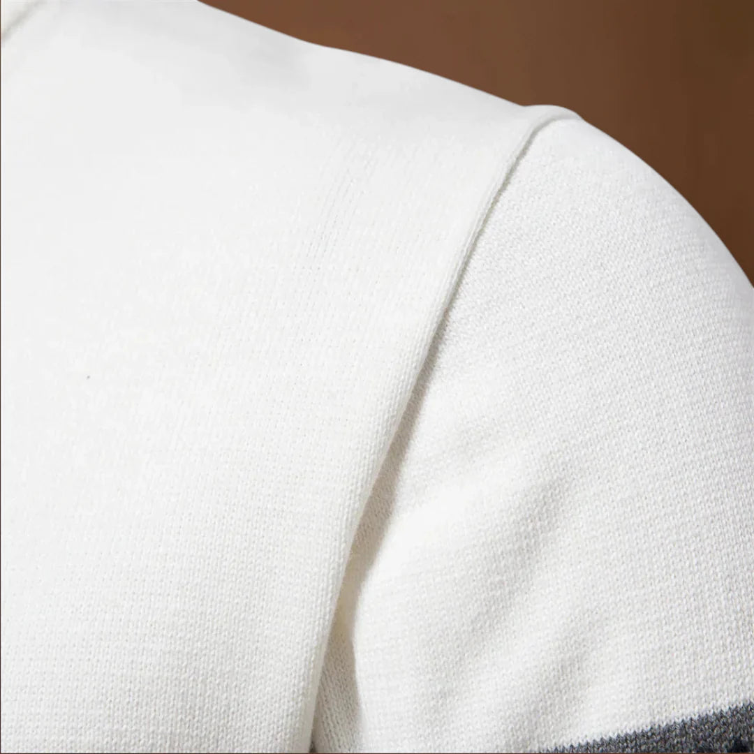 A dizájn a funkcionalitásra összpontosít. A gallér zárva viselve több meleget, nyitva viselve pedig szellőzést biztosít. Az alakja klasszikus, de modern megjelenést kölcsönöz, amely könnyen átfedhető külső ruházattal vagy ingekkel. A pulóver puha kötött anyagból készült, amely egyensúlyt teremt a melegség és a könnyű ápolás között.