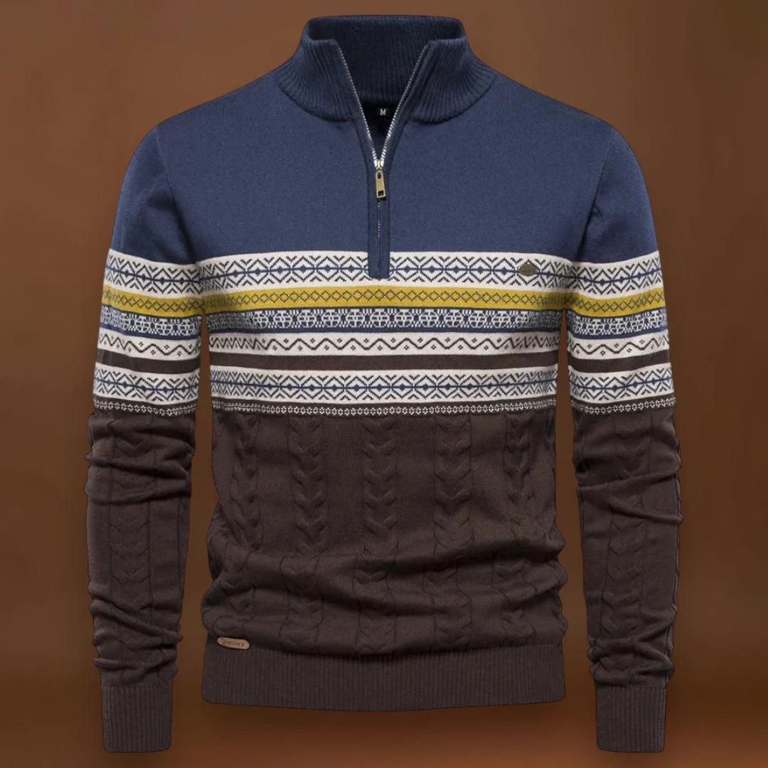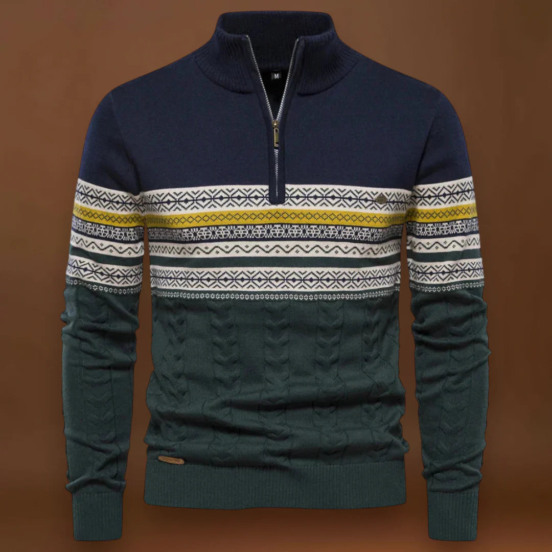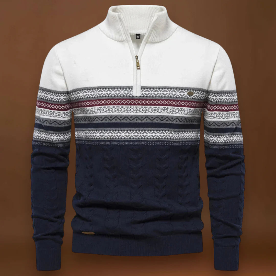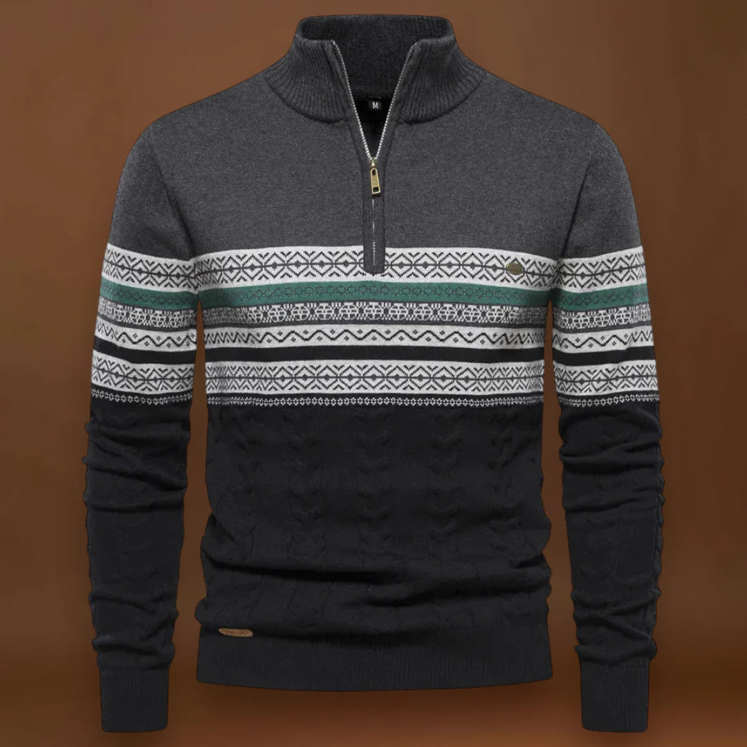 A dizájn a funkcionalitásra összpontosít. A gallér zárva viselve több meleget, nyitva viselve pedig szellőzést biztosít. Az alakja klasszikus, de modern megjelenést kölcsönöz, amely könnyen átfedhető külső ruházattal vagy ingekkel. A pulóver puha kötött anyagból készült, amely egyensúlyt teremt a melegség és a könnyű ápolás között.