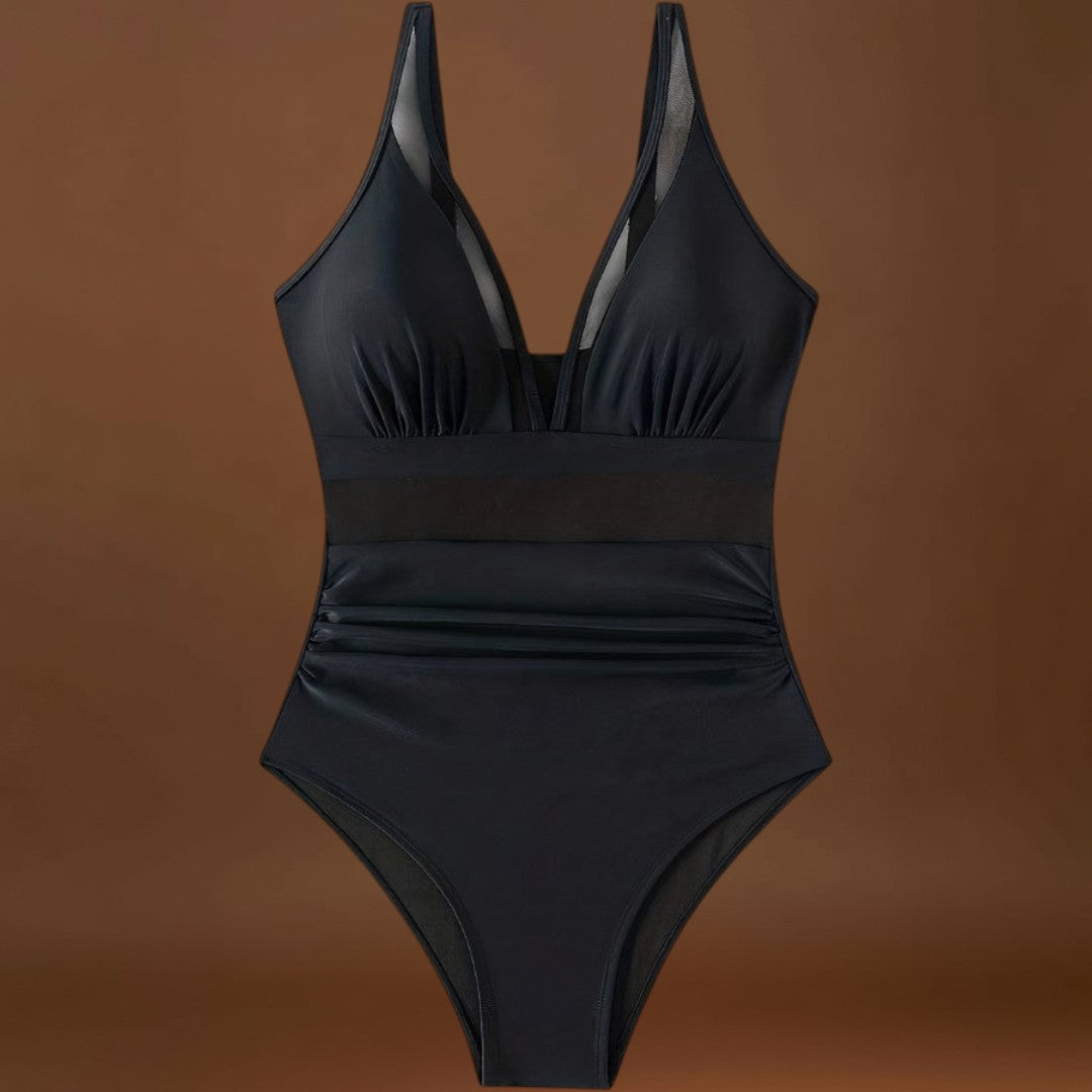 Ez a fürdőruha a tökéletes egyensúly a kifinomultság és a merészség között. Átlátszó tüll betétekkel és mély dekoltázzsal rendelkezik, elegánsan és határozottan emeli ki a vonalakat. Ideális azok számára, akik modern és erőteljes megjelenéssel szeretnének kitűnni a strandon vagy a medencénél.