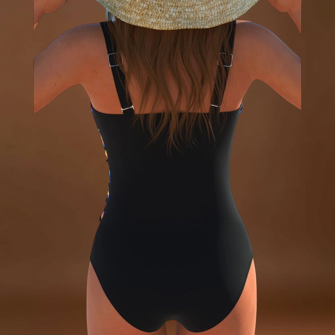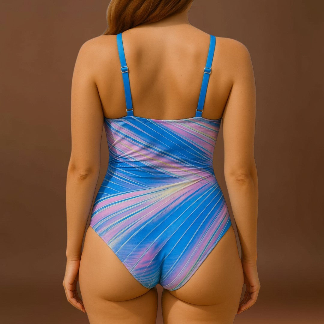 Ez a fürdőruha azoknak készült, akik magabiztosan, kényelmesen és tele élettel szeretnének lenni a tengerparton vagy a medencénél. A vibráló, neon színekben pompázó mintázat és a keresztpántos dizájn karcsúsítja a sziluettet, ez a darab a divatot és a funkcionalitást egyesíti egyetlen merülésben. Az oldalsó ráncolás és a állítható masni lehetővé teszi a testhez való tökéletes illeszkedést, míg a mellkasi finom tartás stílusosan biztosítja a biztonságot.