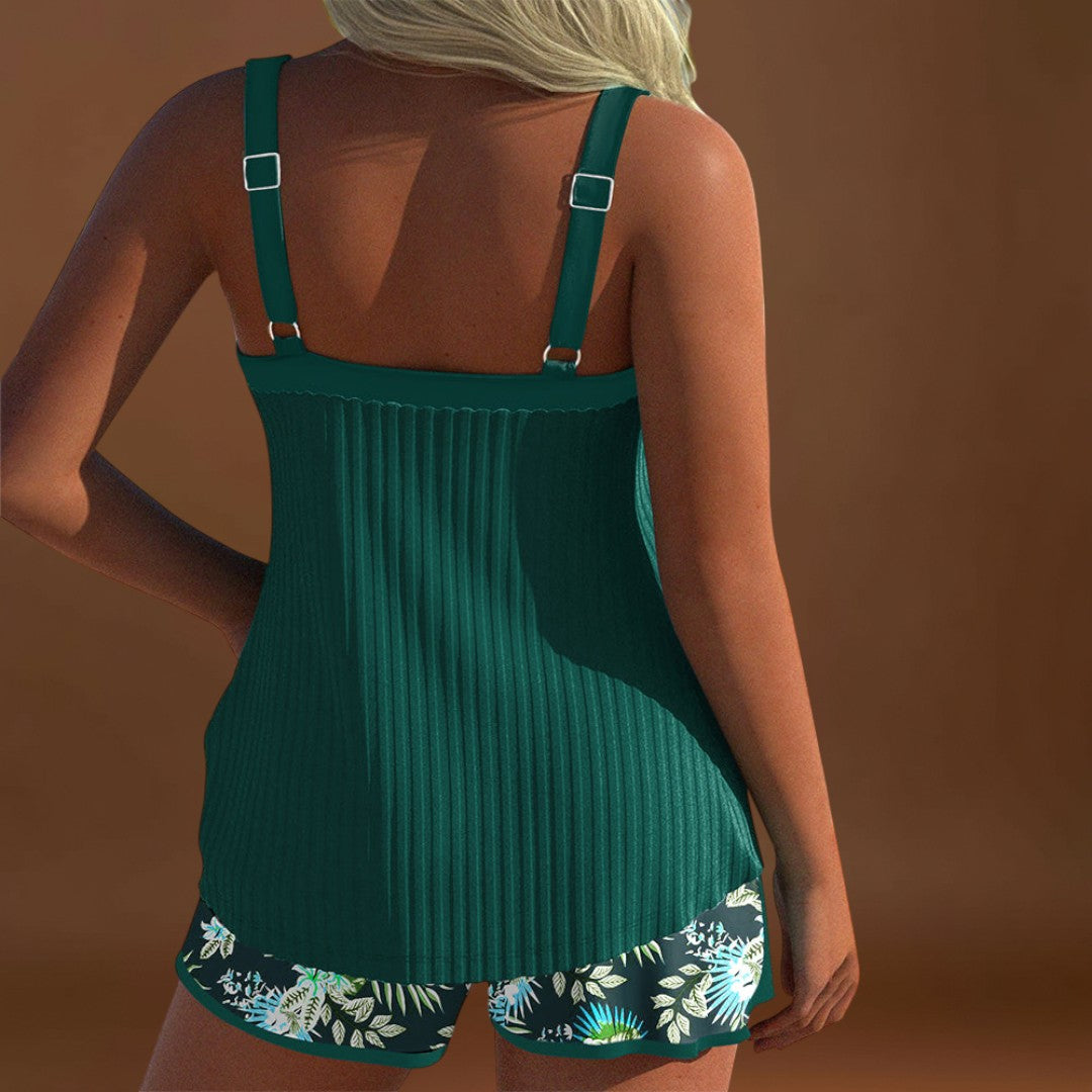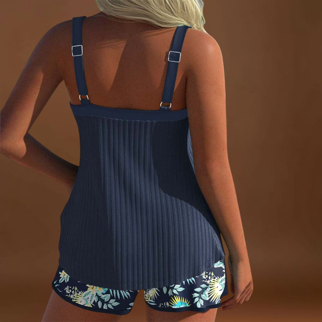 Ez a bikini lágyan álcázza a hasat a magas derekú alsókkal, amelyek kedveznek a sziluettnek anélkül, hogy szorítanának. A háromszög alakú, állítható felső támogatást nyújt nyomás nélkül – ideális egy változó test számára. A hátul nyitott, masnival ellátott dizájn tökéletes illeszkedést és nőies részletet biztosít. A vidám mintázat és az összehangolt szett teljes és elegáns nyári megjelenést teremt. Az elasztikus anyag kényelmet és mozgásszabadságot garantál.