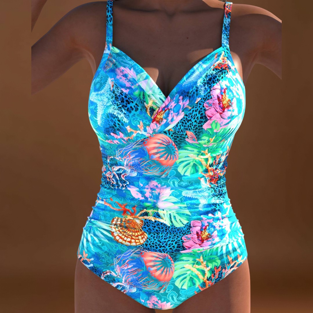 A vibráló trópusi mintájával és a has körüli finom redőkkel ez a fürdőruha pontosan ott camouflál, ahol szeretnéd. A V-nyak elegánsan kiemeli a dekoltázst, míg a puha melltartóbetétek és a stabil pántok támogatják a melleket. Tökéletes azoknak, akik nőiesnek és magabiztosnak szeretnék érezni magukat – anélkül, hogy bármiről lemondanának.