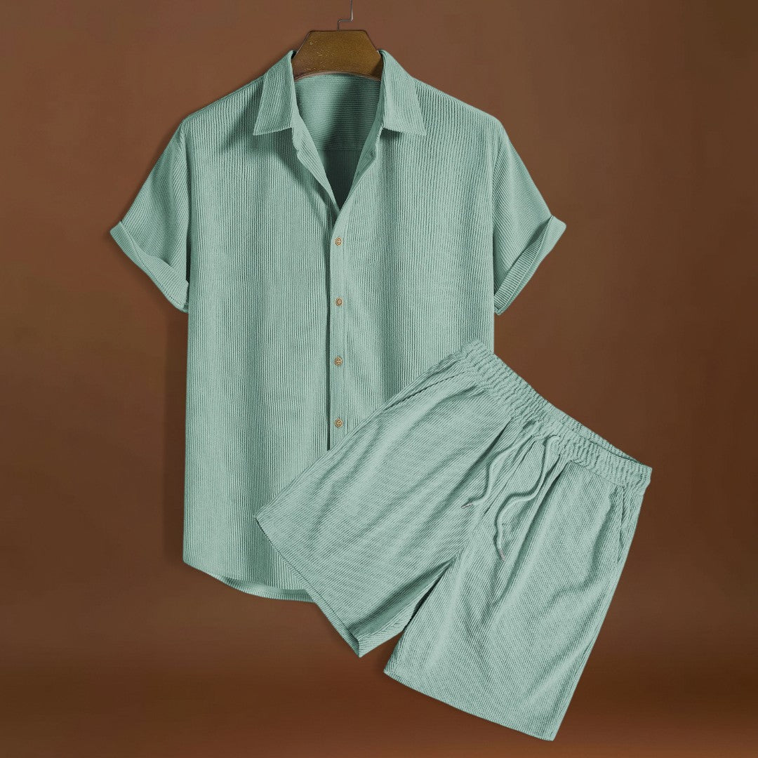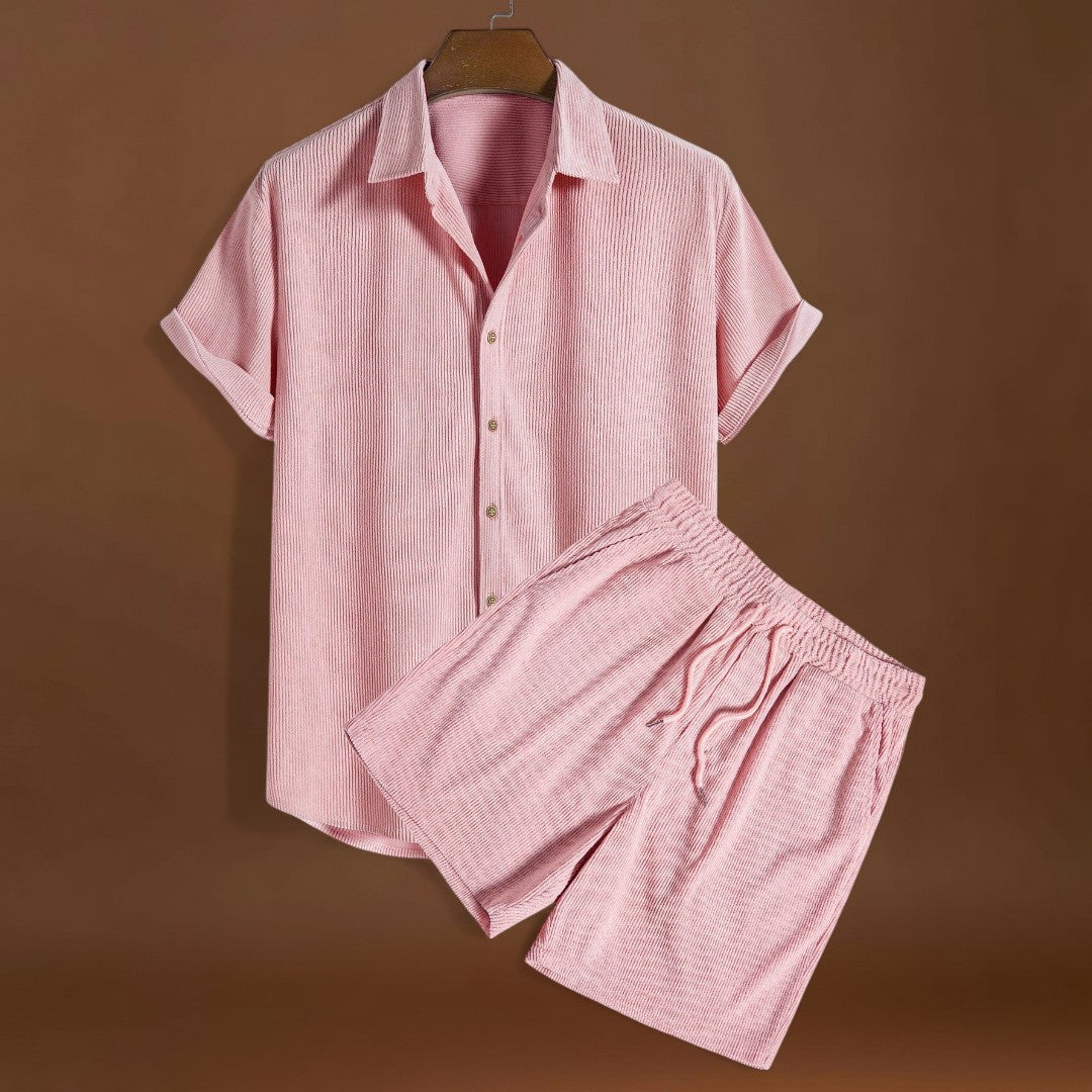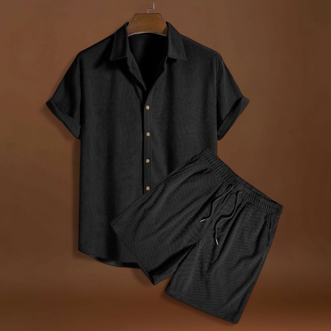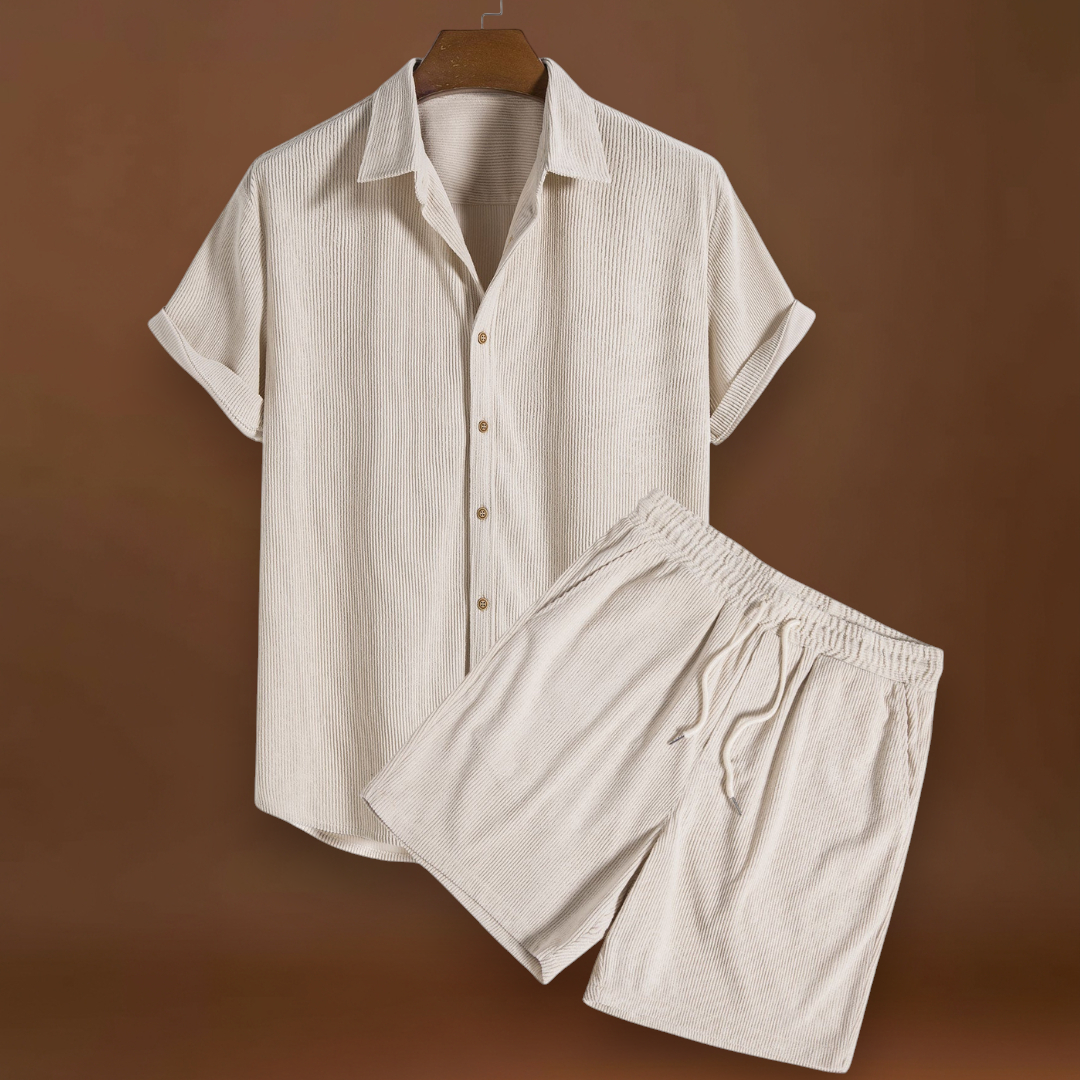 Ez a rövid ujjú szett egy rövid ujjú felsőt kombinál összehangolt nadrágokkal. Könnyű és lélegző anyagokat használ, hogy segítse a levegő áramlását és csökkentse a hő felhalmozódását. A dizájn lehetővé teszi a könnyű mozgást és az egyszerű rétegezést.