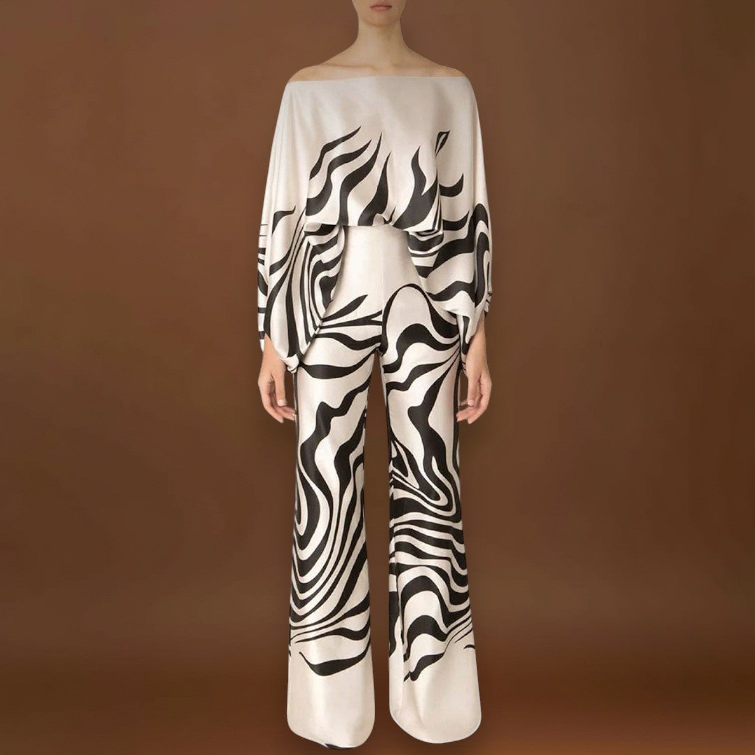 A Luisa szett a stílus és a hozzáállás robbanása. A vibráló rózsaszín, narancs és piros hullámos mintája off-white háttéren folyékony szabással és egy kis glamúrral párosul. Az egy vállú, széles ujjú blúz mozgást ad, míg a flare nadrág nyújtja a sziluettet — tökéletes azoknak, akik szeretnék, hogy a megjelenésük figyelemfelkeltő, miközben kényelmesek és elegánsak maradnak.