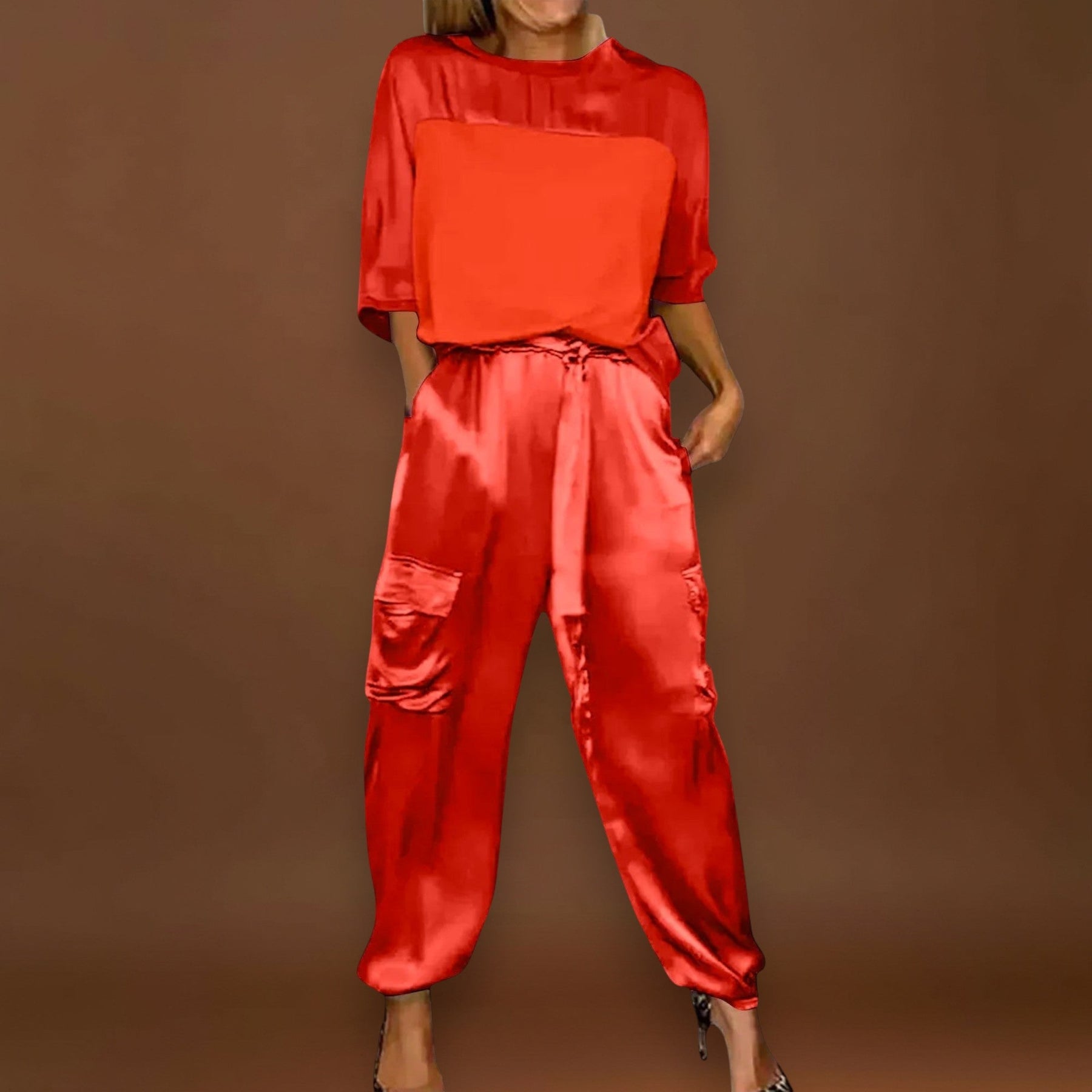 Puha és lélegző selyemből készült, ez a szett az eleganciát és a sokoldalúságot ötvözi, így ideális mindennapi viselethez, mind pedig esti kimenetekhez. A félhosszú ujjú blúz kifinomultságot ad, míg a laza szabású nadrág maximális kényelmet és mozgásszabadságot garantál.
