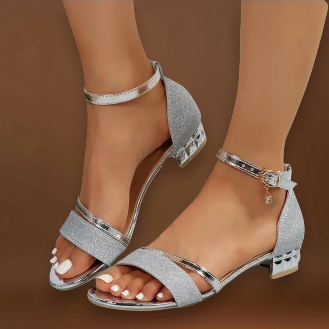 Ezek a szandálok a csillogás glamúrját ötvözik az arany fémes részletek kifinomultságával. A közepes, strukturált sarok tökéletes egyensúlyt kínál a stílus és a kényelem között, így ideálisak különleges alkalmakra vagy a mindennapi megjelenésed feldobására. A bokán lévő pántos zár biztosítja a biztonságot és egy ellenállhatatlan nőies érintést.