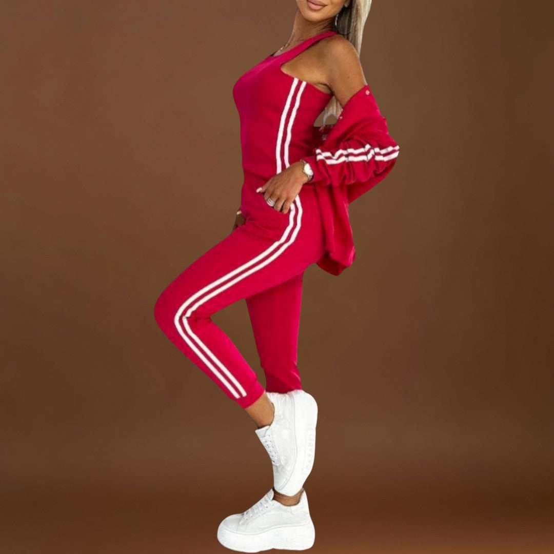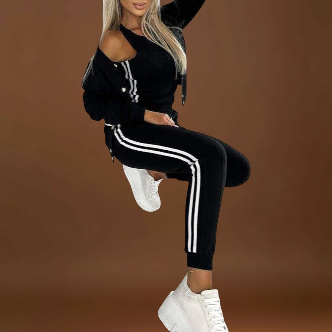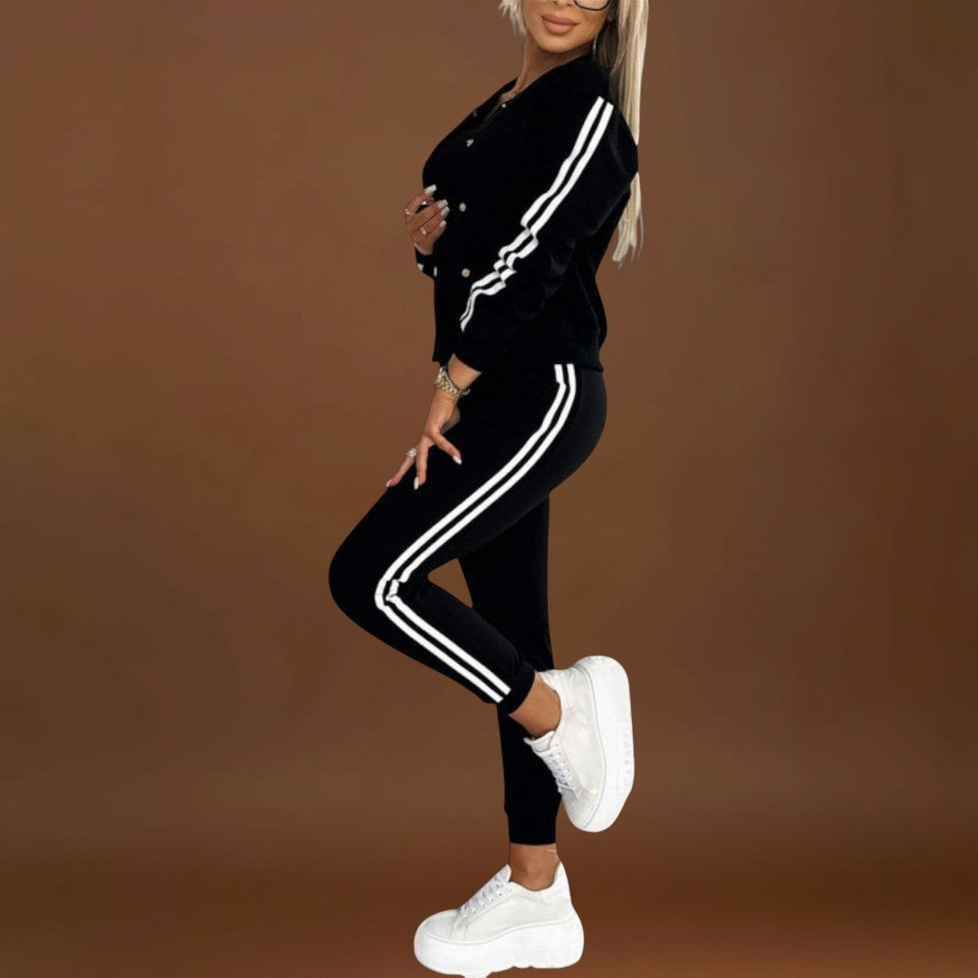 • Modern és nőies megjelenés – A karokon és a nadrágon lévő csíkos dizájn sportos-chic érintést ad, ami sosem marad észrevétlen.