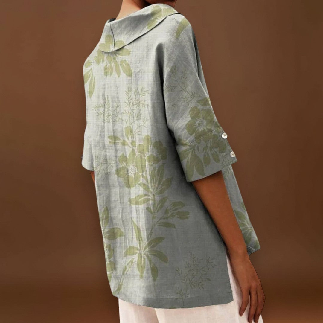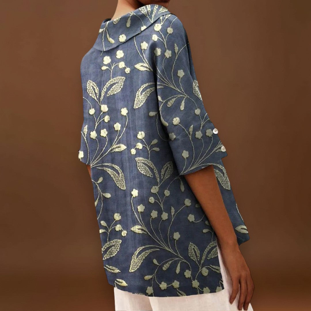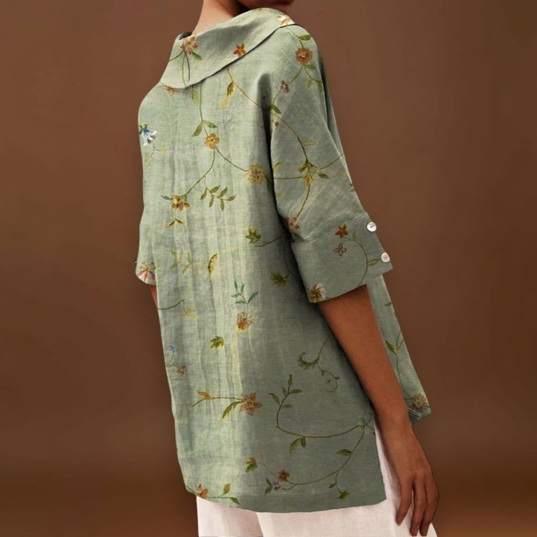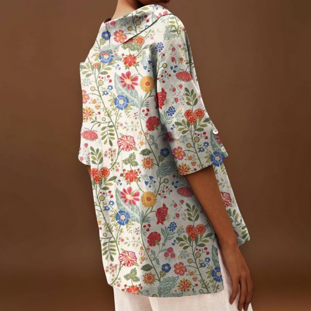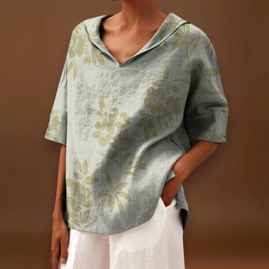 A Flávia - Elegáns Vászon Top az eleganciát kényelmes viselettel ötvözi. Prémium vászon és pamut keverékéből készült. Könnyű és kellemes viselni – ideális meleg napokra. A vidám virágminta laza, mégis kifinomult megjelenést kölcsönöz a dizájnnak. Tökéletes tavaszra és nyárra: könnyű, kényelmes és sokoldalú bármilyen alkalomra.