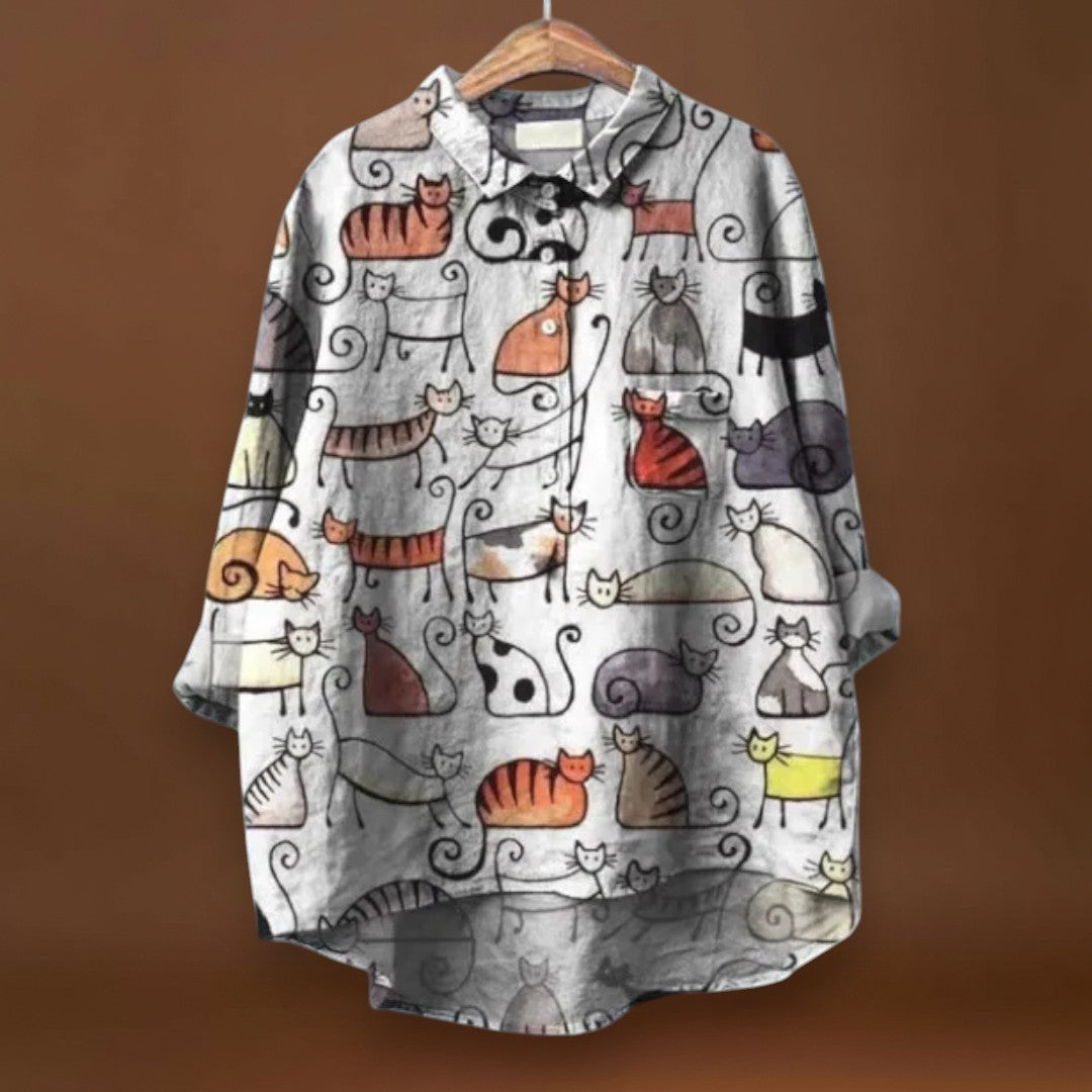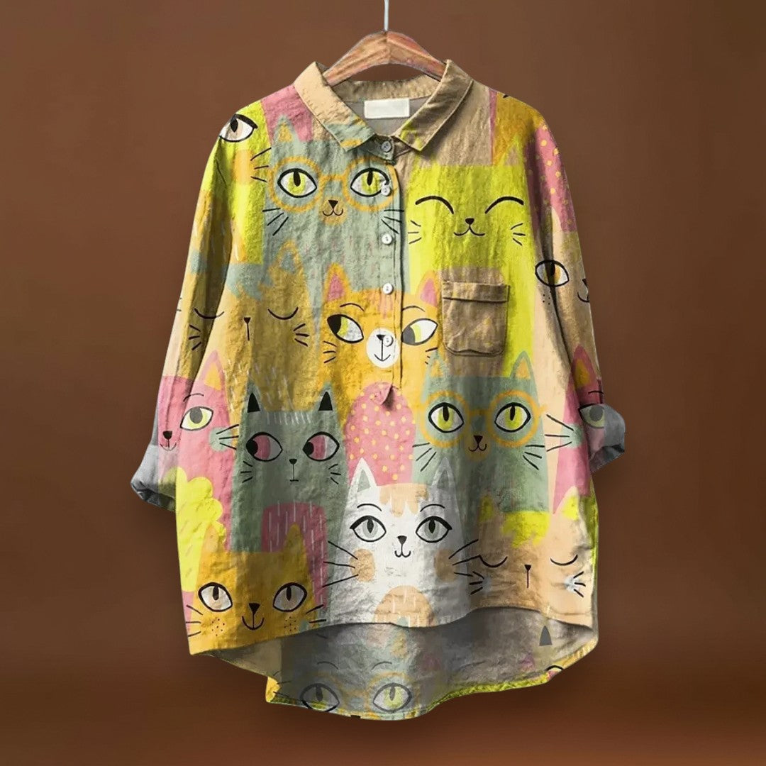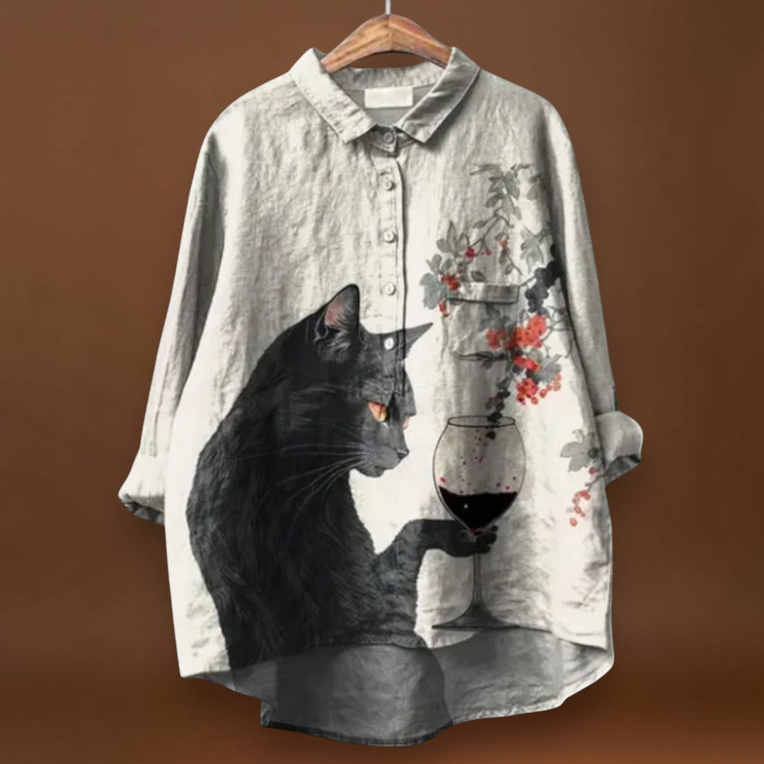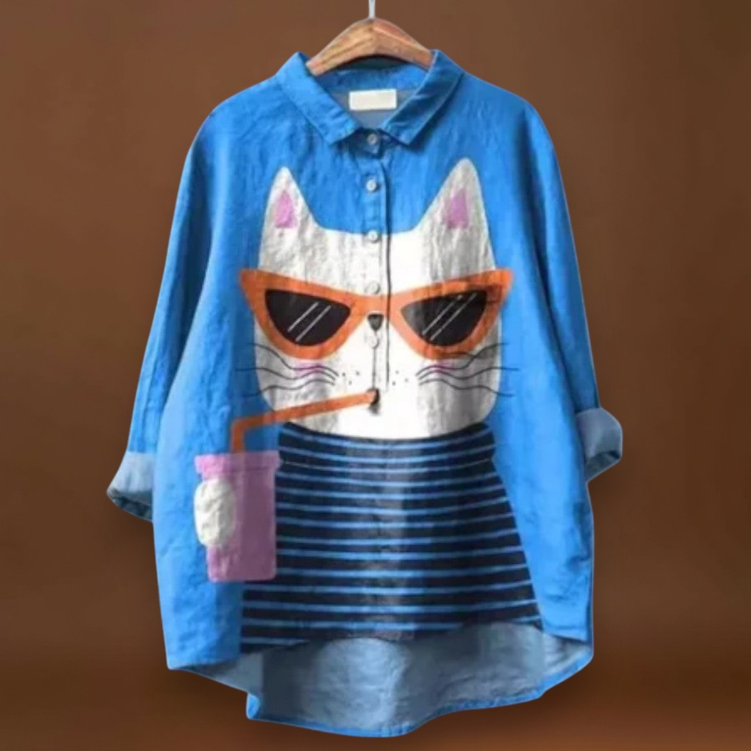Ez a póló tökéletes azoknak, akik szeretik az egyedi és szórakoztató darabokat! A stílusos szemüveges macska és a kezében lévő ital mintájával egy merész és kreatív érintést ad a megjelenésnek. Ideális hétköznapi összeállításokhoz, jól kombinálható farmerrel, leggings-szel vagy sorttal, hogy könnyed és tele attitűddel rendelkező lookot kapjunk.