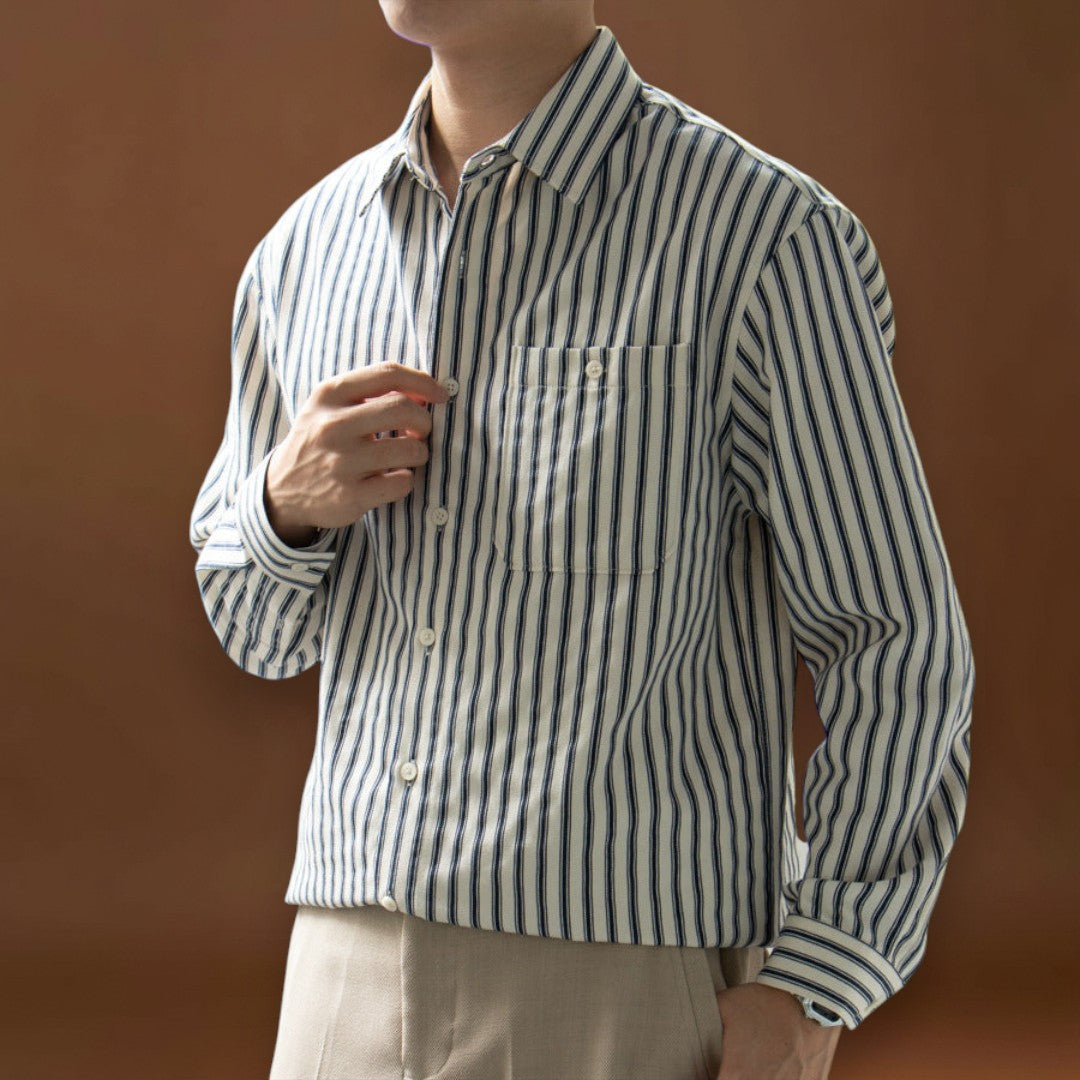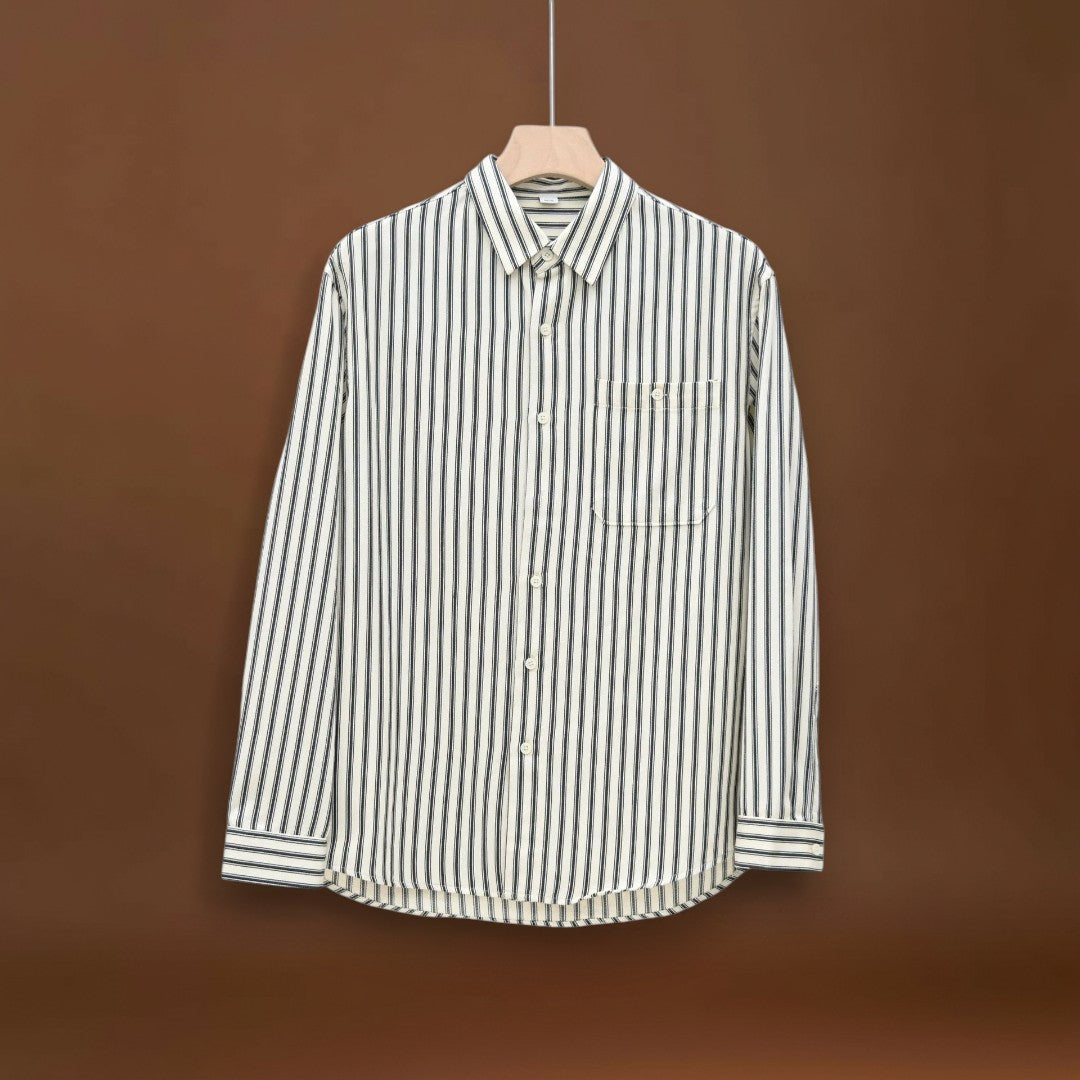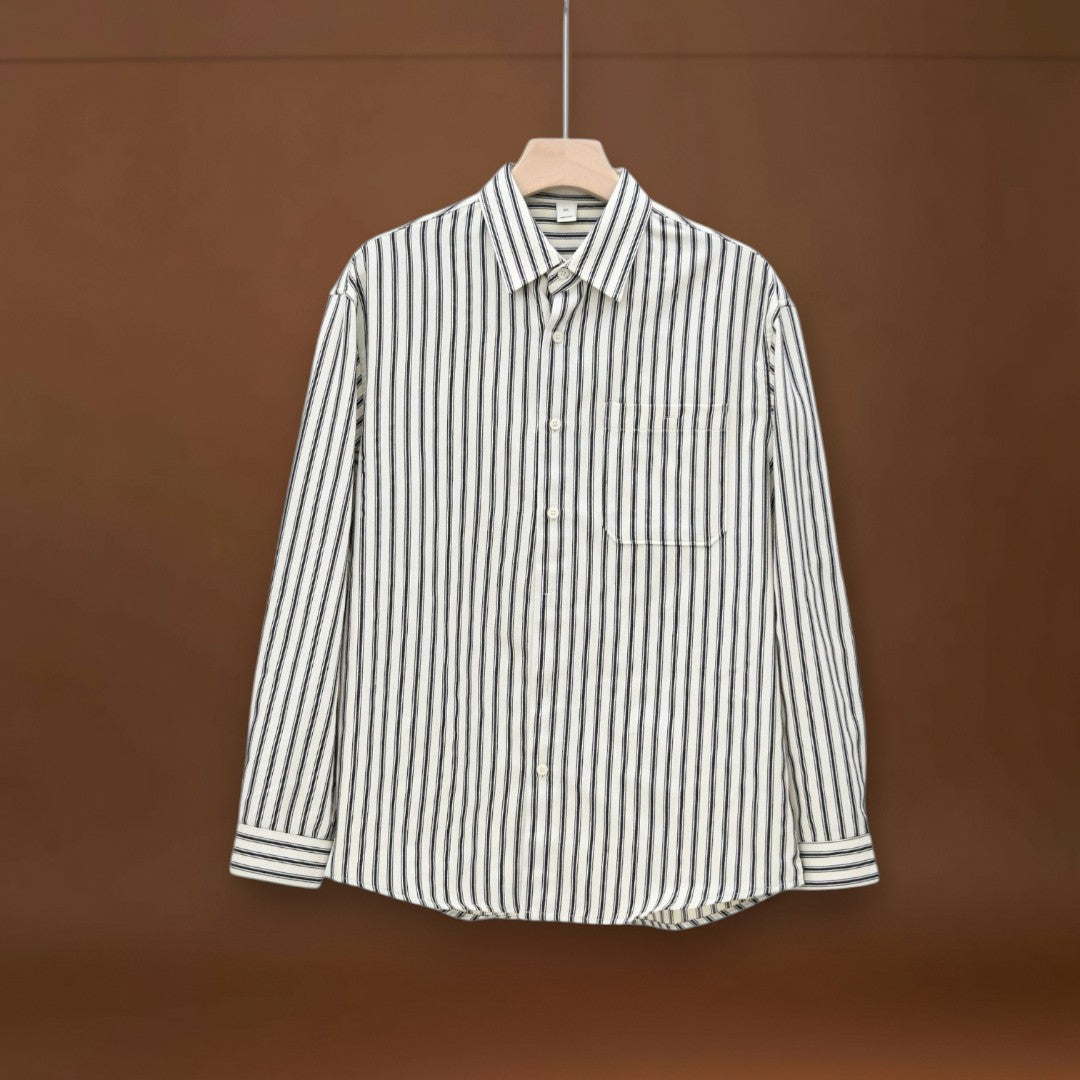 Ez a hosszú ujjú csíkos ing egy laza sziluettet ötvöz a formális illeszkedéssel. Az ing tiszta fehér alapja finom függőleges csíkokkal rendelkezik, amelyek tiszta és strukturált megjelenést kölcsönöznek. A hosszú ujjak a csuklóig érnek, teljes védelmet nyújtva a karoknak, miközben sima vonalat tartanak fenn a külső ruházat alatt.