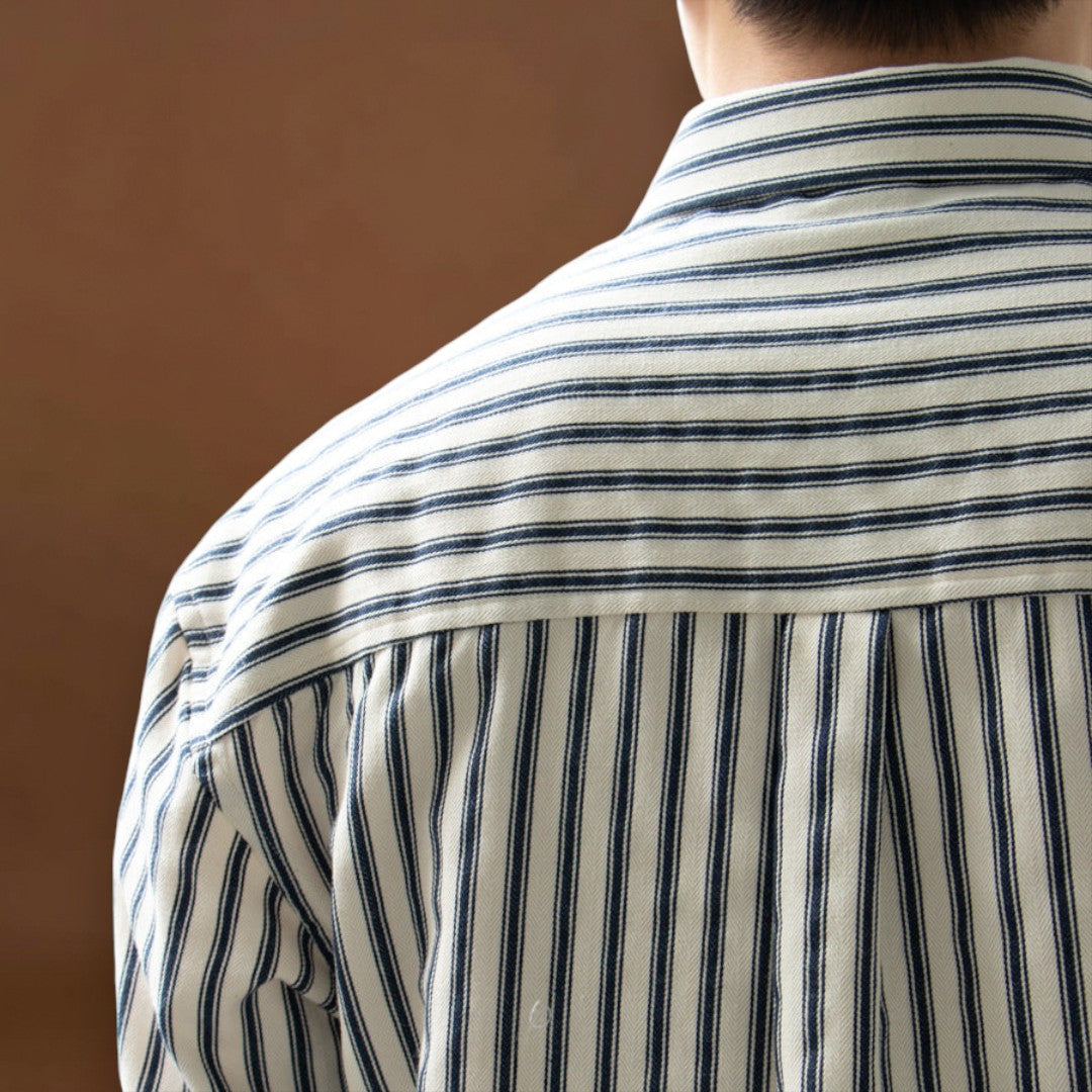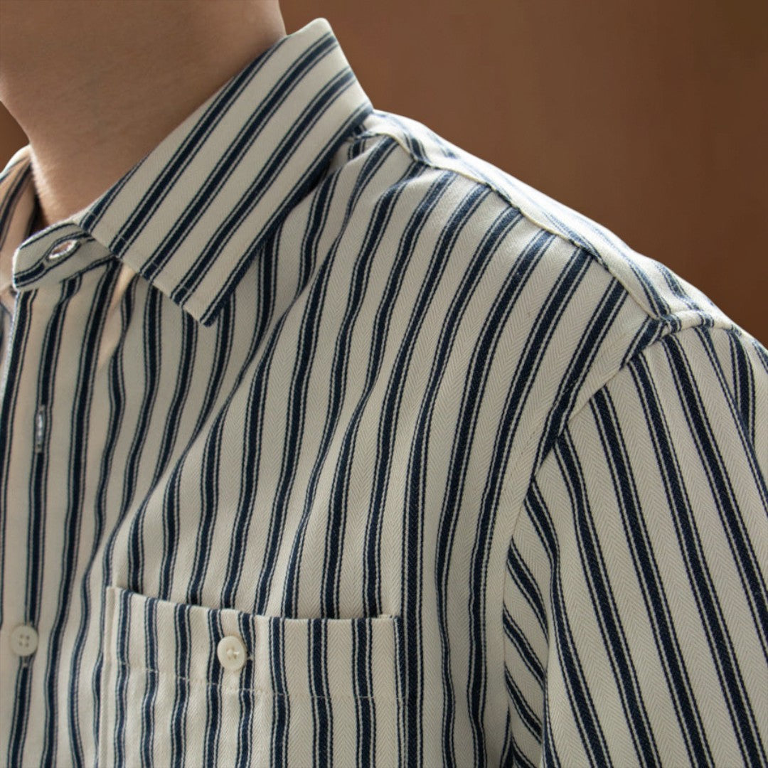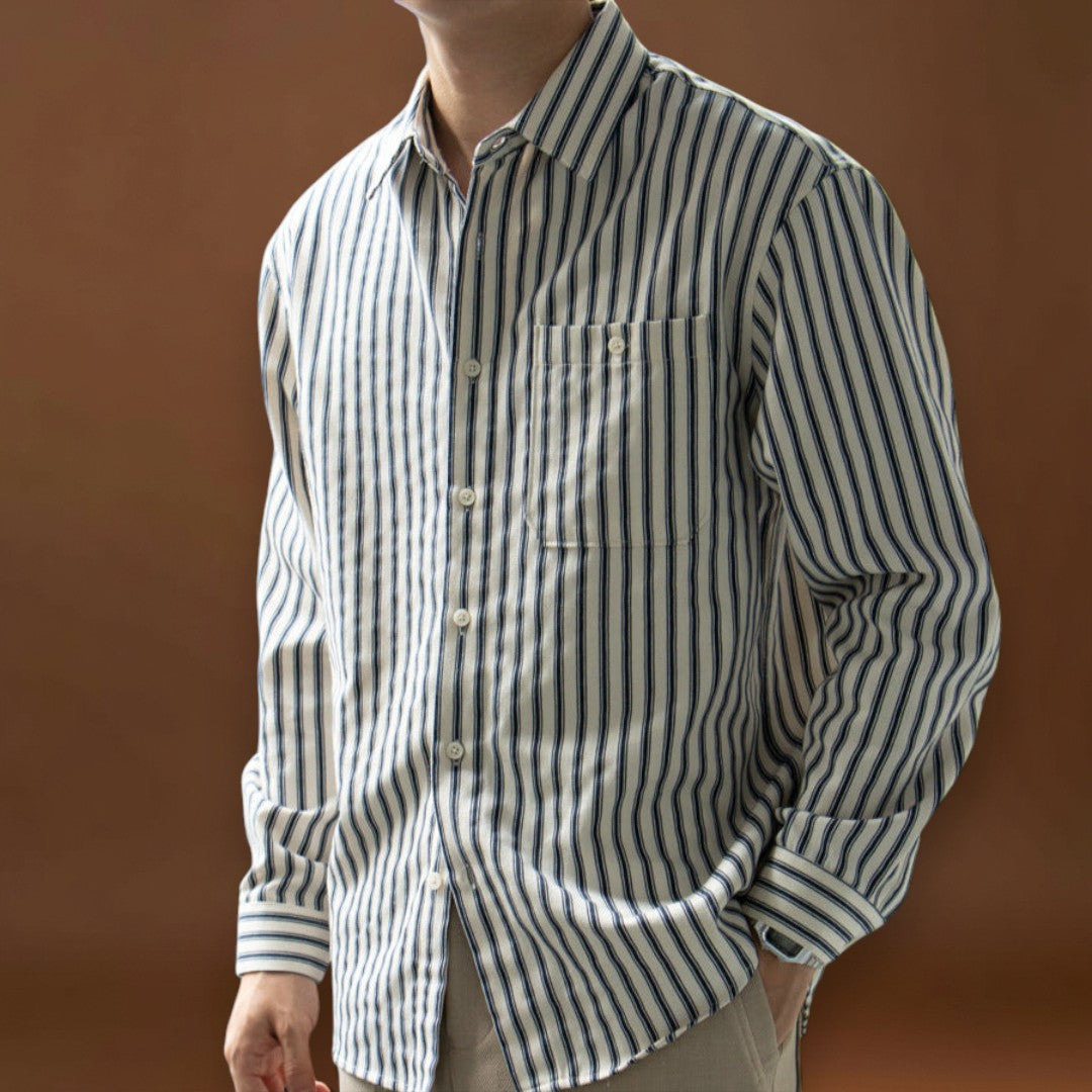 Ez a hosszú ujjú csíkos ing egy laza sziluettet ötvöz a formális illeszkedéssel. Az ing tiszta fehér alapja finom függőleges csíkokkal rendelkezik, amelyek tiszta és strukturált megjelenést kölcsönöznek. A hosszú ujjak a csuklóig érnek, teljes védelmet nyújtva a karoknak, miközben sima vonalat tartanak fenn a külső ruházat alatt.