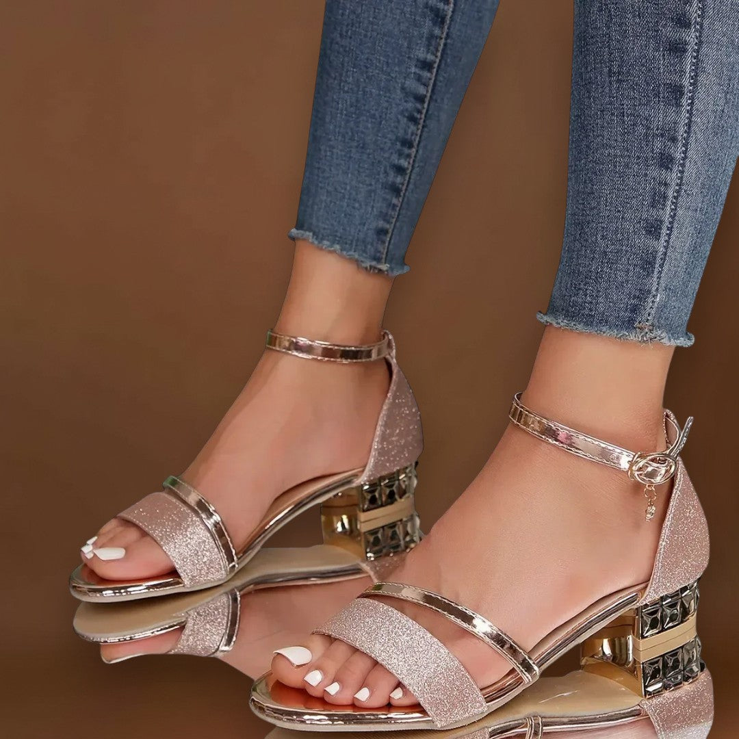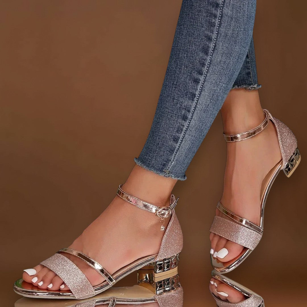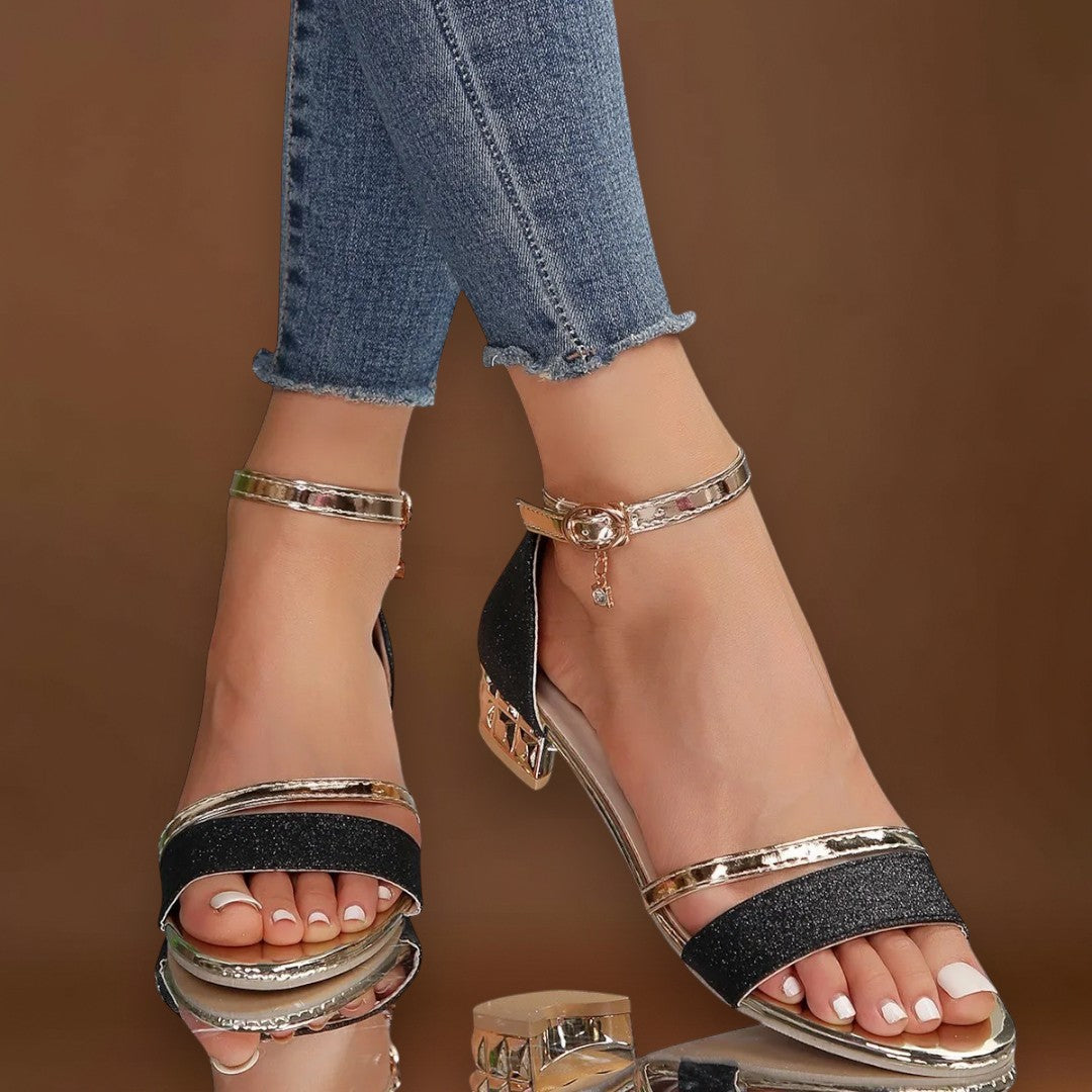 Ez a szandál a ragyogás glamourját ötvözi az arany fém részletek kifinomultságával. A közepes, struktúrált sarok tökéletes egyensúlyt biztosít a stílus és a kényelem között, így ideális különleges alkalmakra vagy a mindennapi megjelenés feldobására. A bokapántos zárás biztonságot és ellenállhatatlan nőiességet garantál.