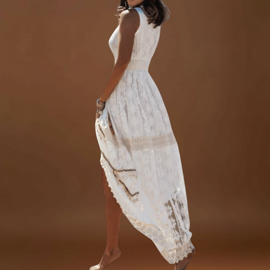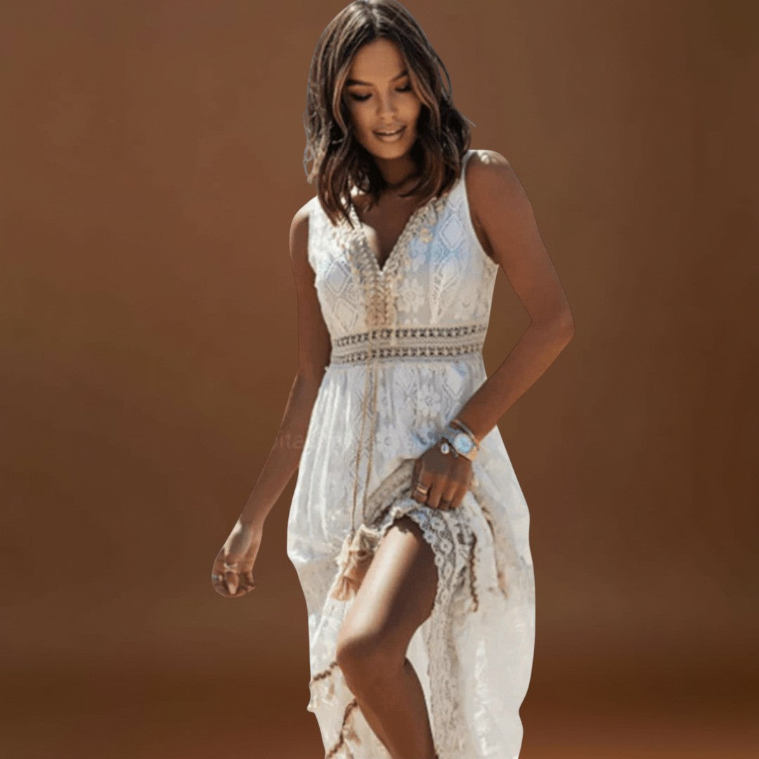 Élvezd a boho stílus laza eleganciáját az Érica maxi ruhával. Tökéletes bármilyen alkalomra, egy A-vonalú, légies sziluettet kombinál finom csipke részletekkel, garantálva egy kifinomult és egyben laza megjelenést.